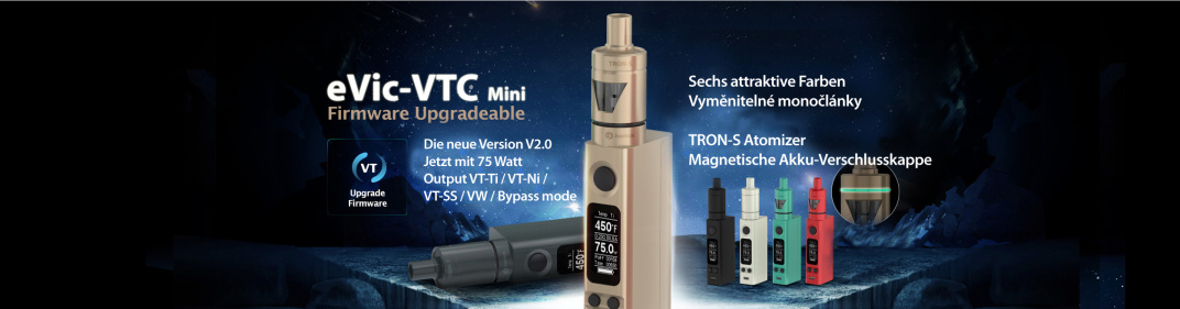 Nach dem erfolgreichen Grip eVIC VTC Mini kommt die verbesserte Version eVic VTC Mini TRON i mit der Version V2.0. Die größte Neuheit liegt in dem Clearomizer. Es handelt sich nicht mehr um die Serie eGo ONE, sondern ein ganz neues Clearomizer TRON. Sein Tank fasst bis zu 4 ml, der Hersteller schlug zwei Arten zur einfachen Pegelüberprüfung des Liquides vor. Die Glühköpfe verbleiben eGo ONE CL, CLR, CL-Ni, CL-Ti und CLR-Ti. Die Leistung dieses Grips wurde vom ursprünglichen 60W auf 75W erhöht.